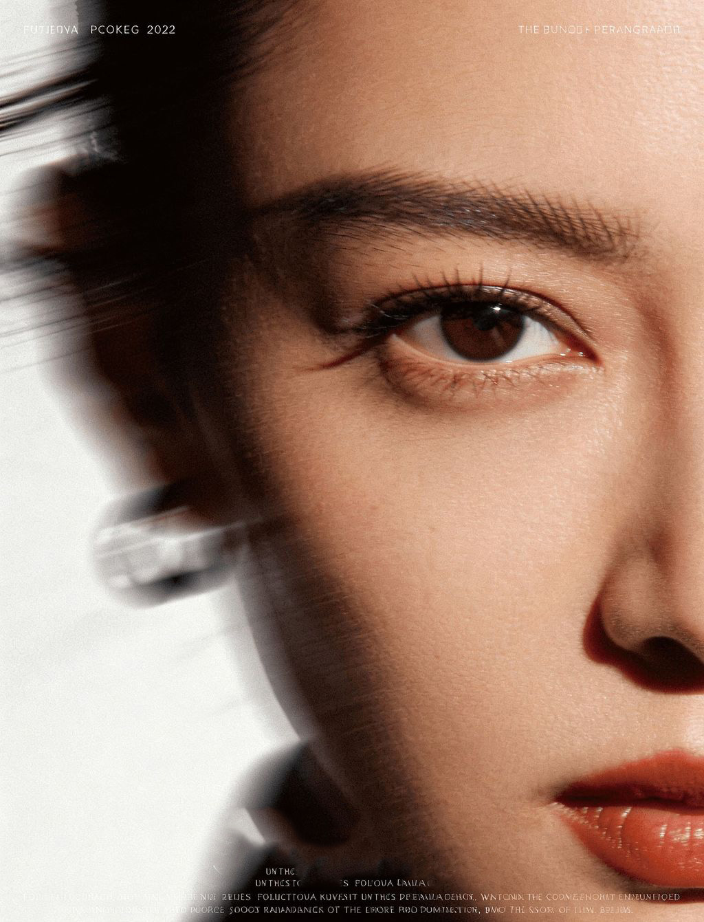 Zhu Shanjin photography, light and shadow, grainy texture, dynamic movement, dynamic posters, minimalist style, blurred forms, female celebrities, ample white space, artistic composition, close-up of face, rich expressions, extreme close-up of half face, showing only one eye with special masculine appeal.