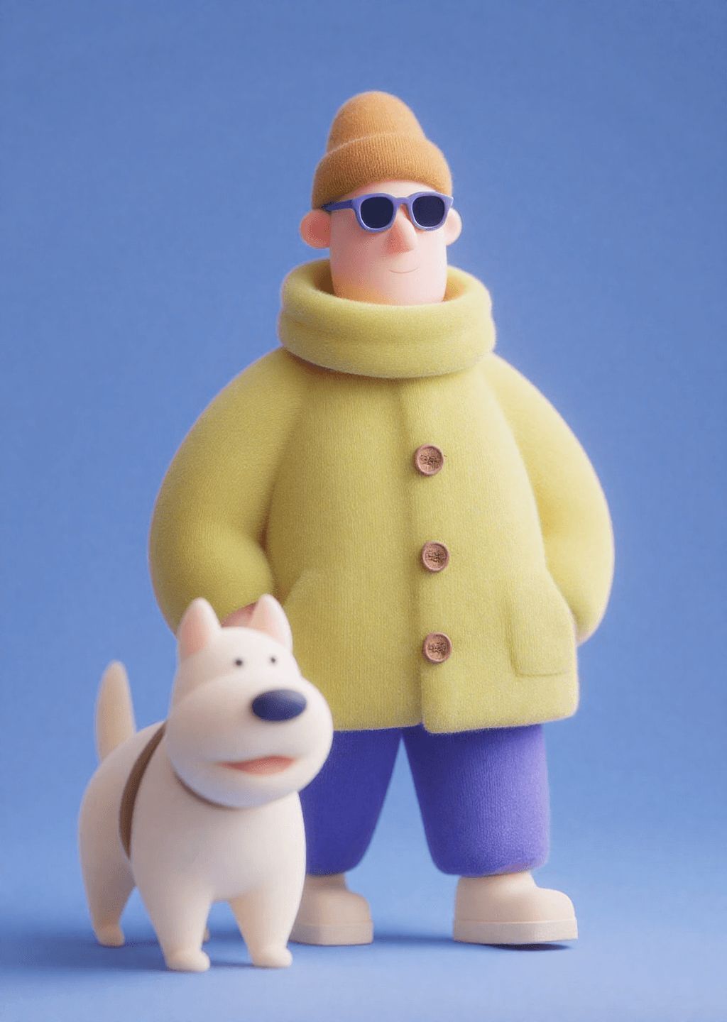 3D, 3D cartoon character in a yellow coat walking with a white puppy in front of a blue background.